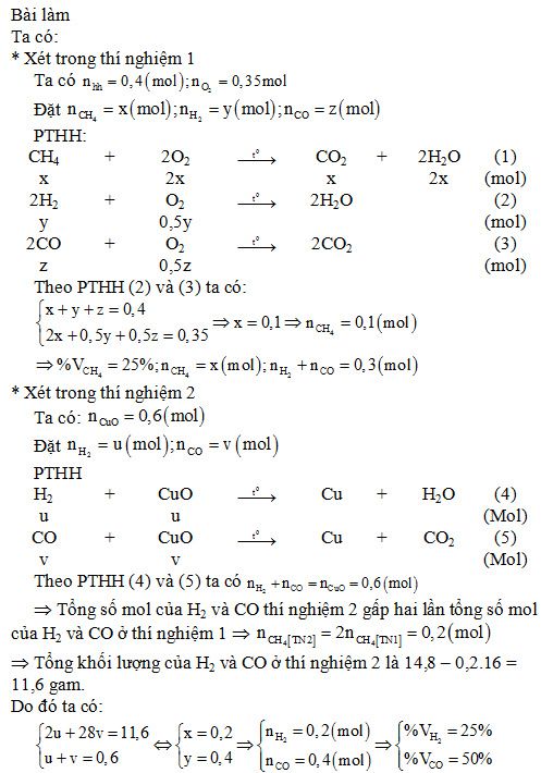 Thí nghiệm 2: Nếu dẫn 14,8 gam hỗn hợp qua ống đựng CuO dư nung nóng thì có 48 gam CuO đã phản ứng.